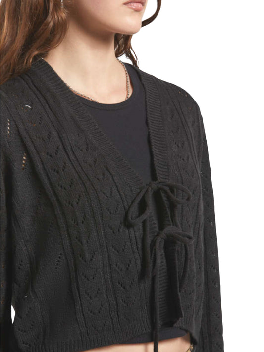 Cropped Pointelle Tie Cardigan - Black