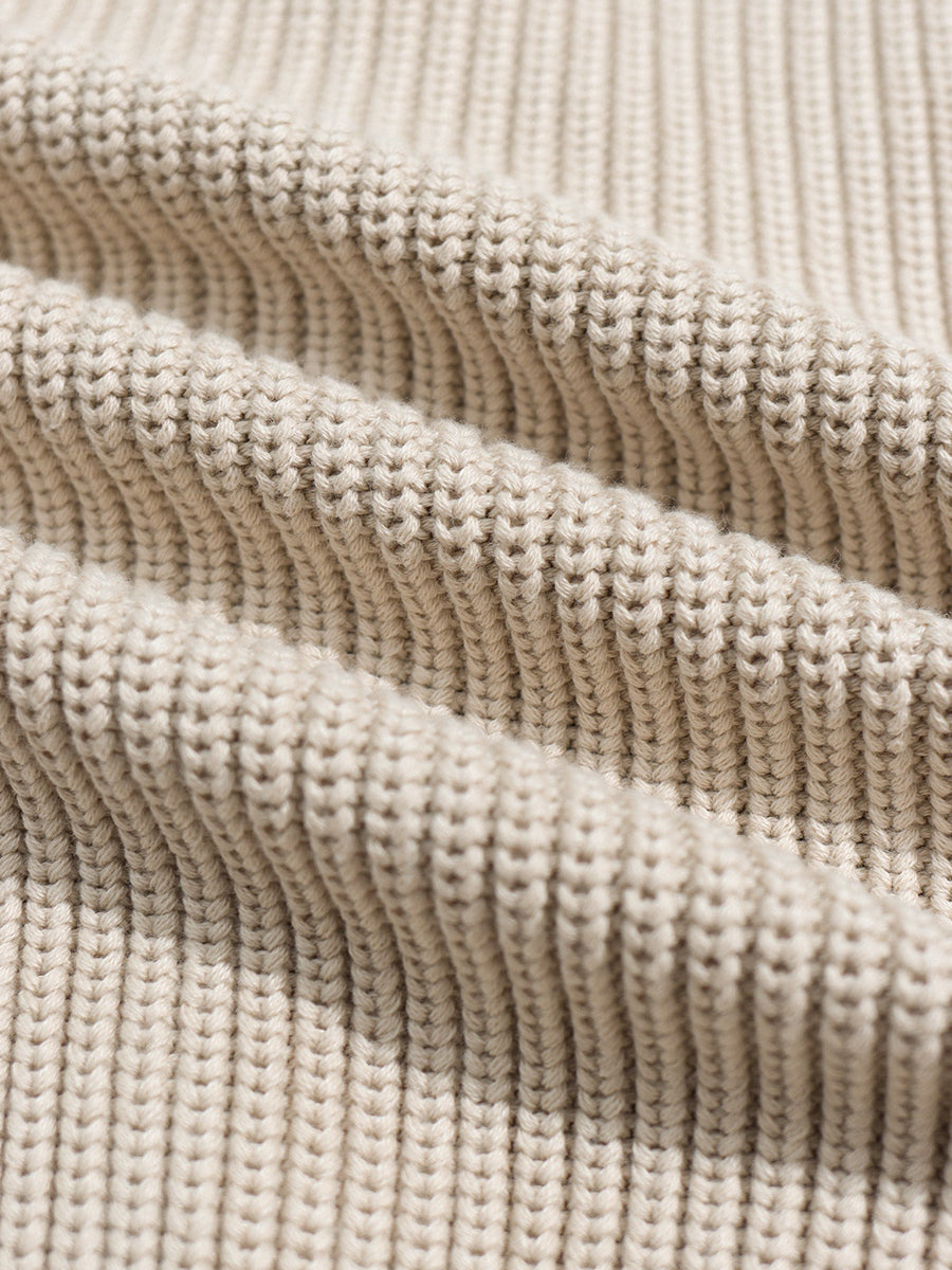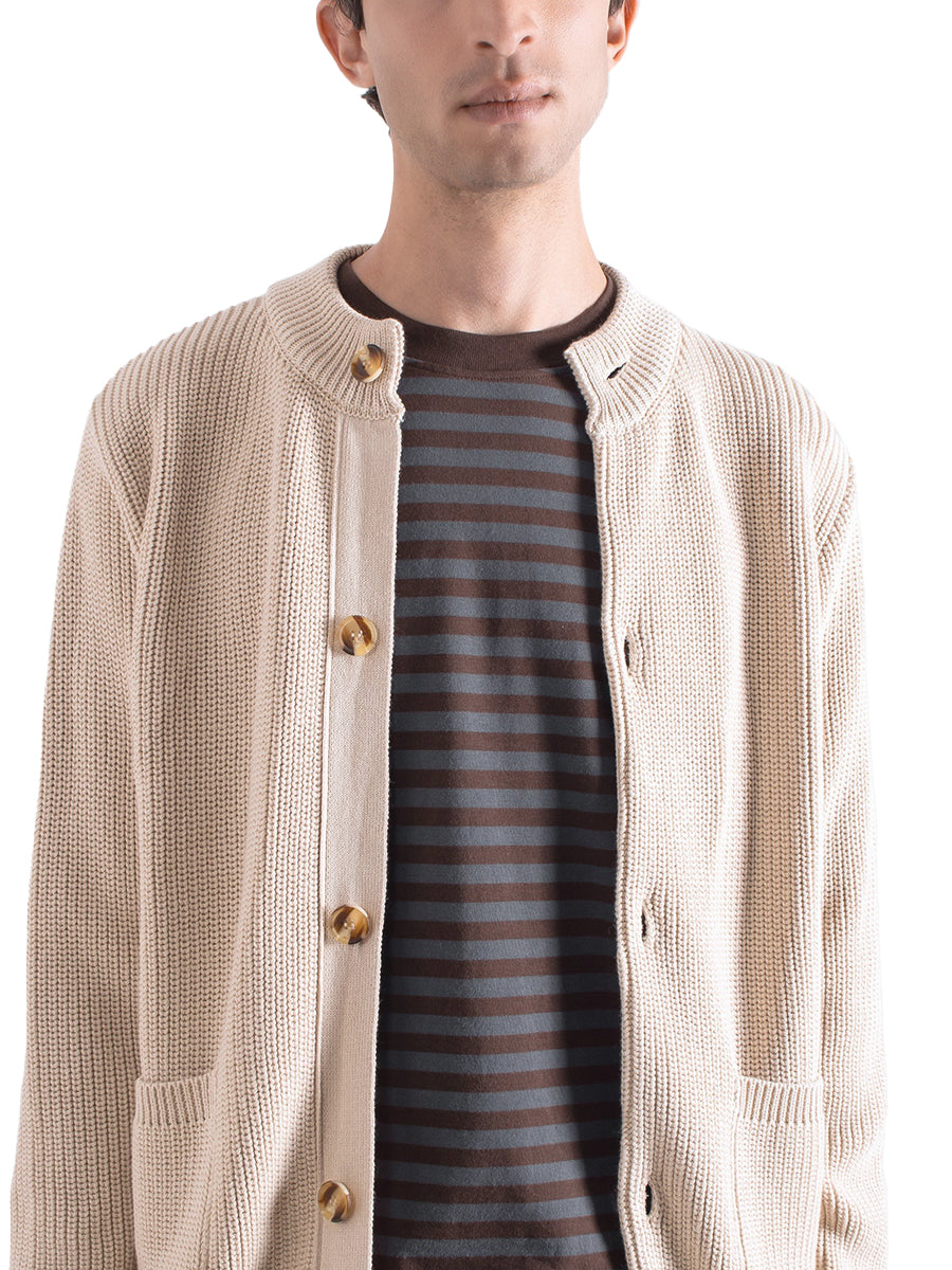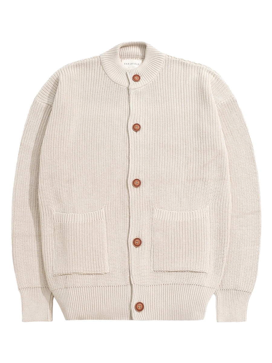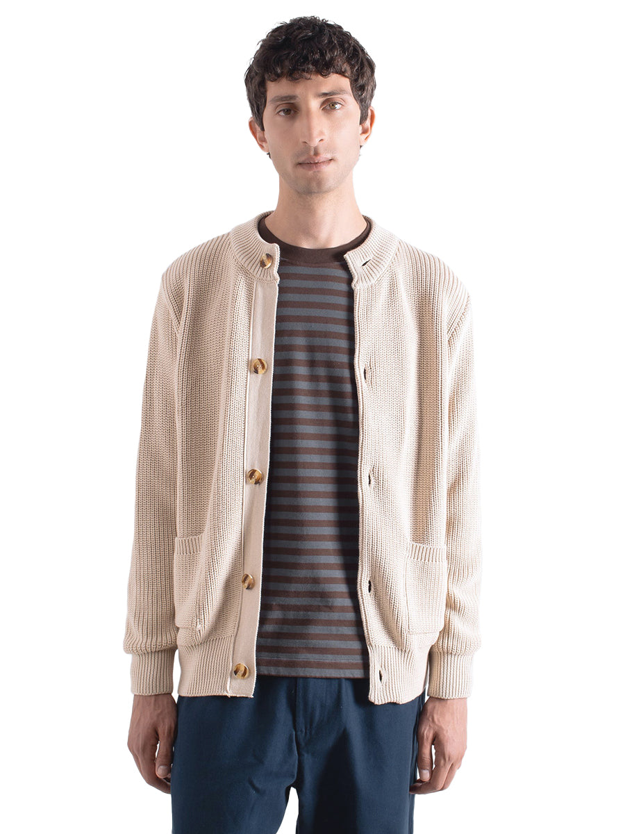 Heavyweight fisherman-inspired crewneck cardigan named after Bauhaus artist & teacher Josef Albers, knit from organic cotton in a vertical rib with a subtle pearl texture.