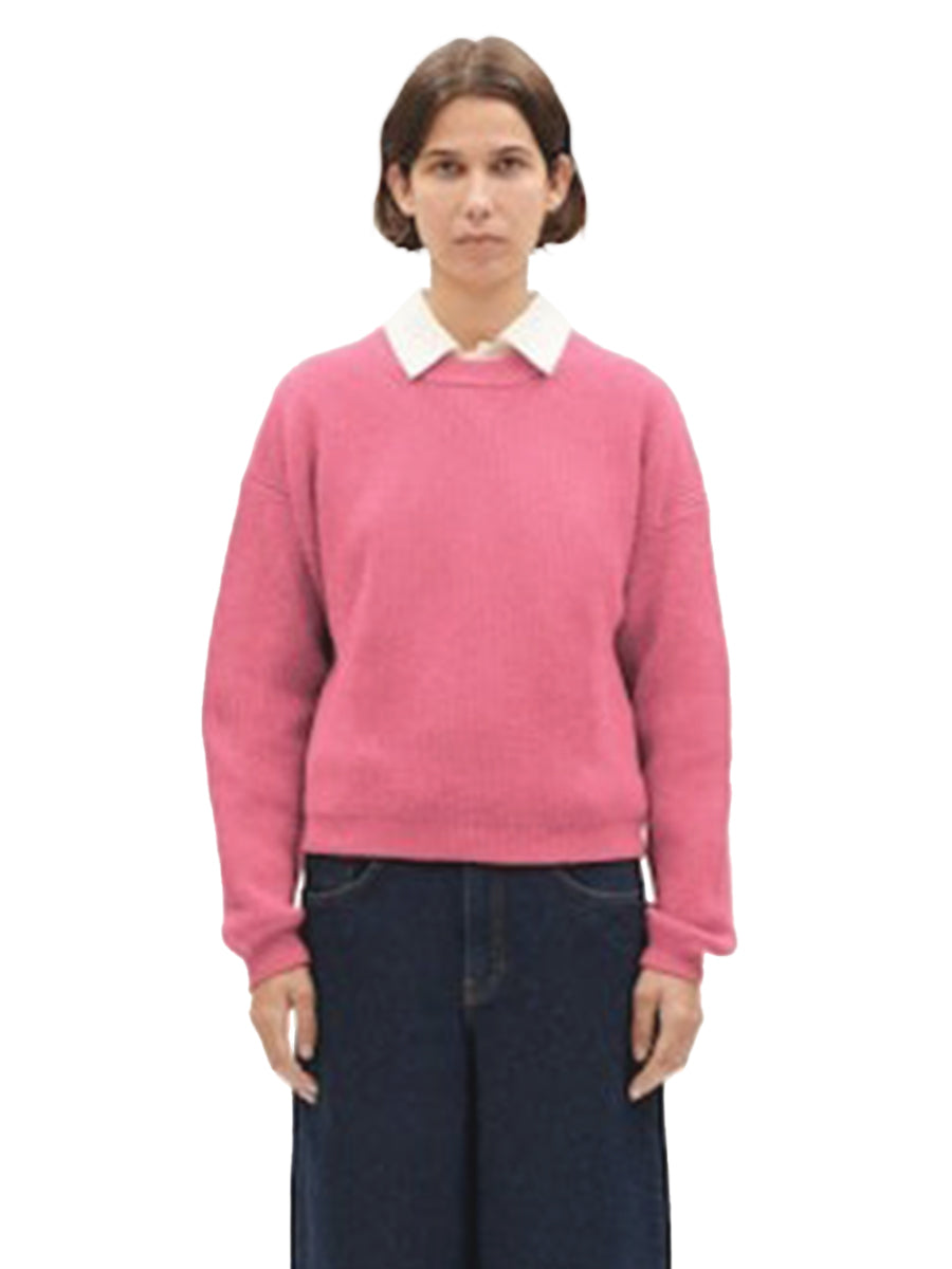 Bright pink rib-knit crewneck organic cotton crewneck sweater.