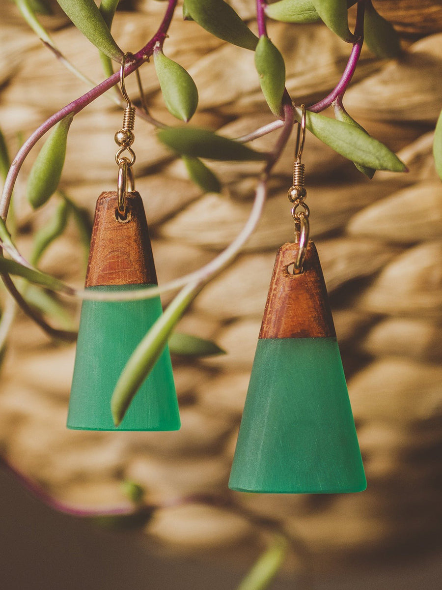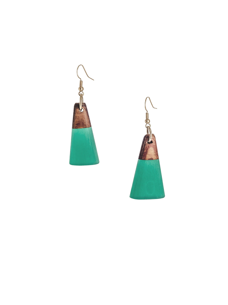 Lightweight & fun geometric dangle earrings with a curved front, made from a wood & resin mix.