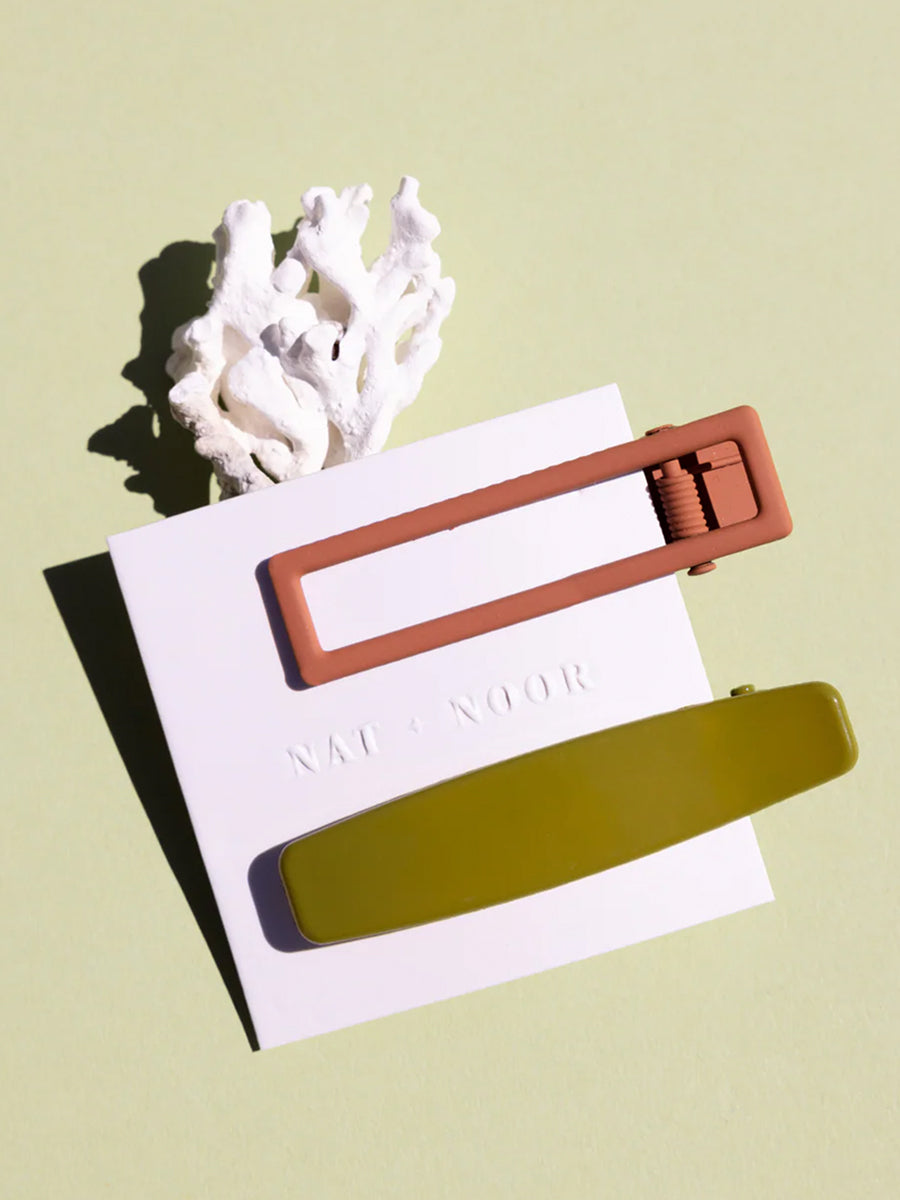 Glossy olive oval curved and matte burnt orange rectangular frame hairclip set.