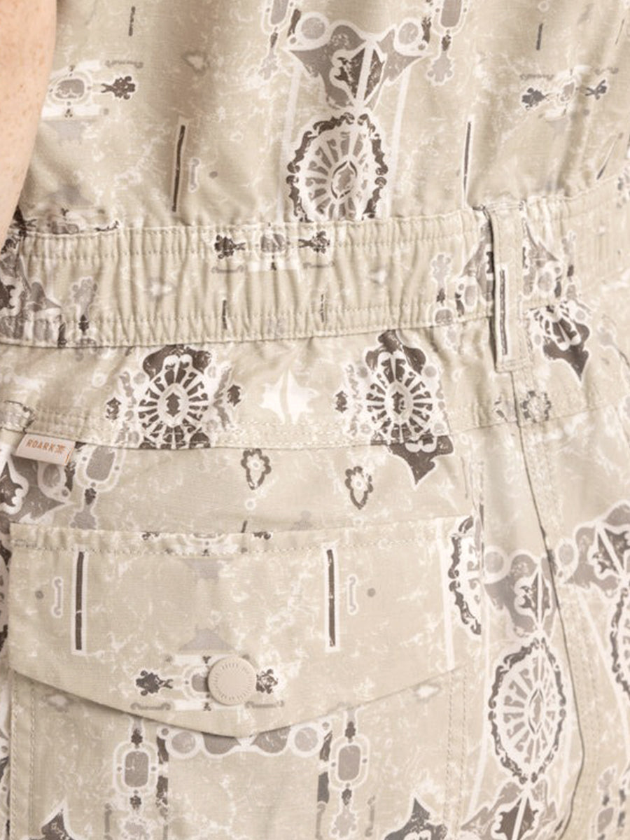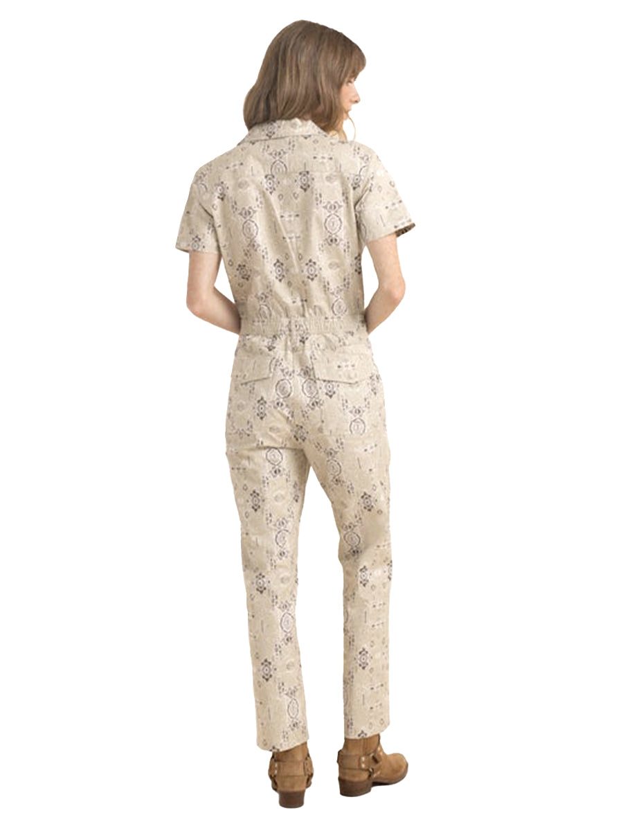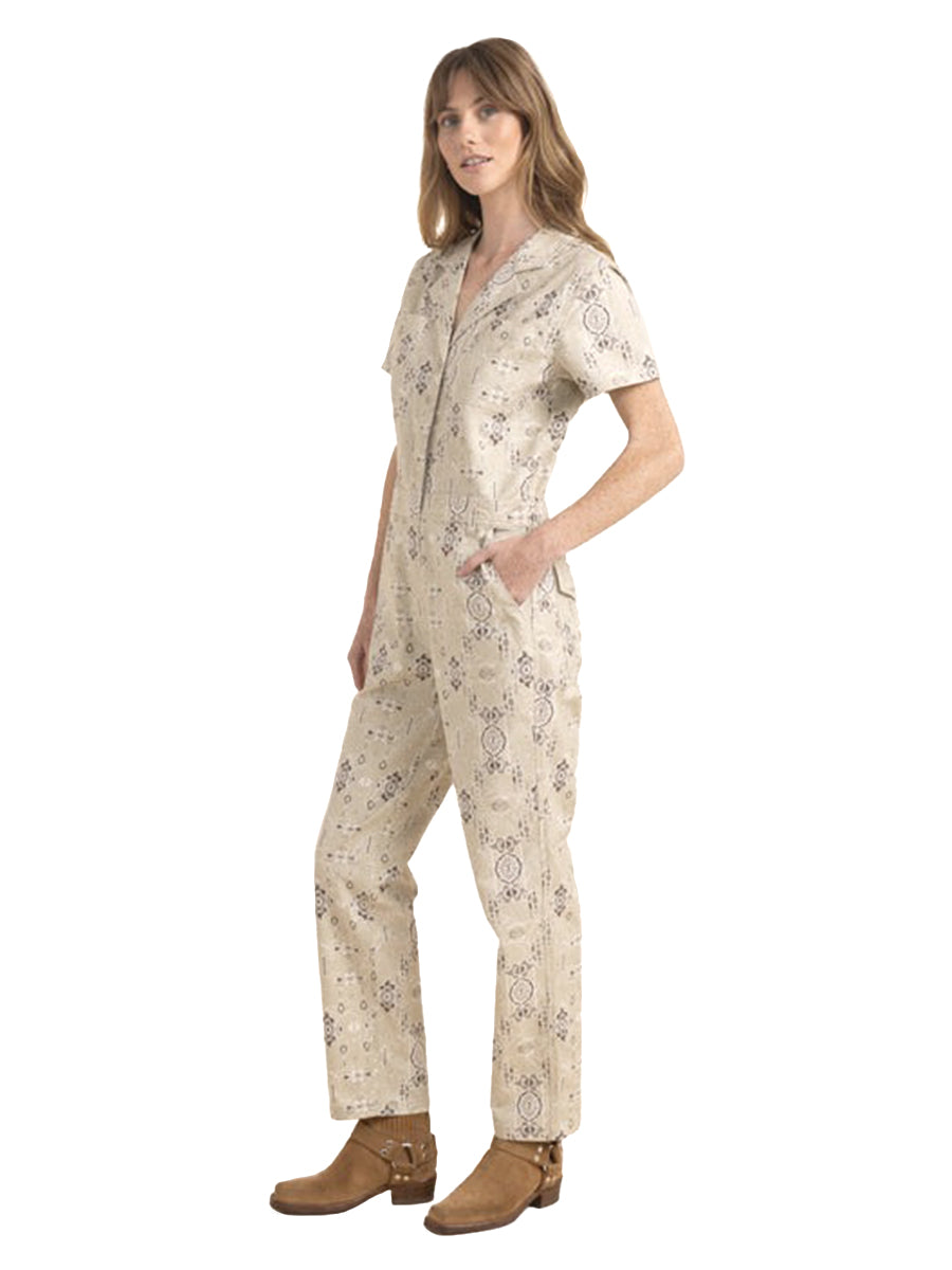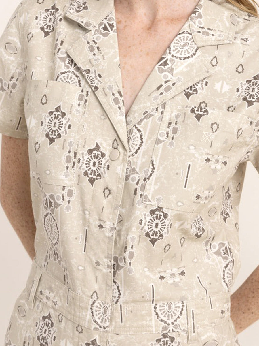 Flattering take on a short sleeve jumpsuit, durable stretch cotton canvas in an all-over print.