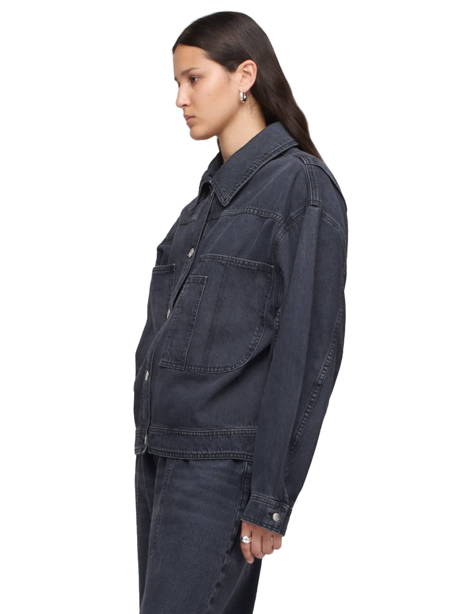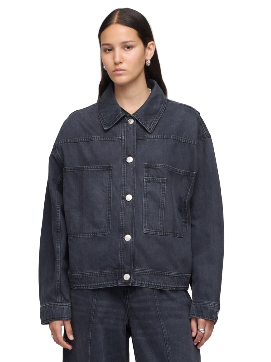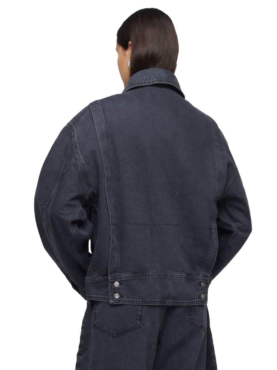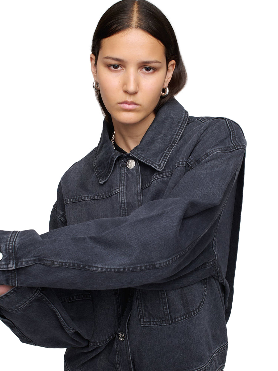 Oversized denim jacket with exaggerated workwear-inspired details