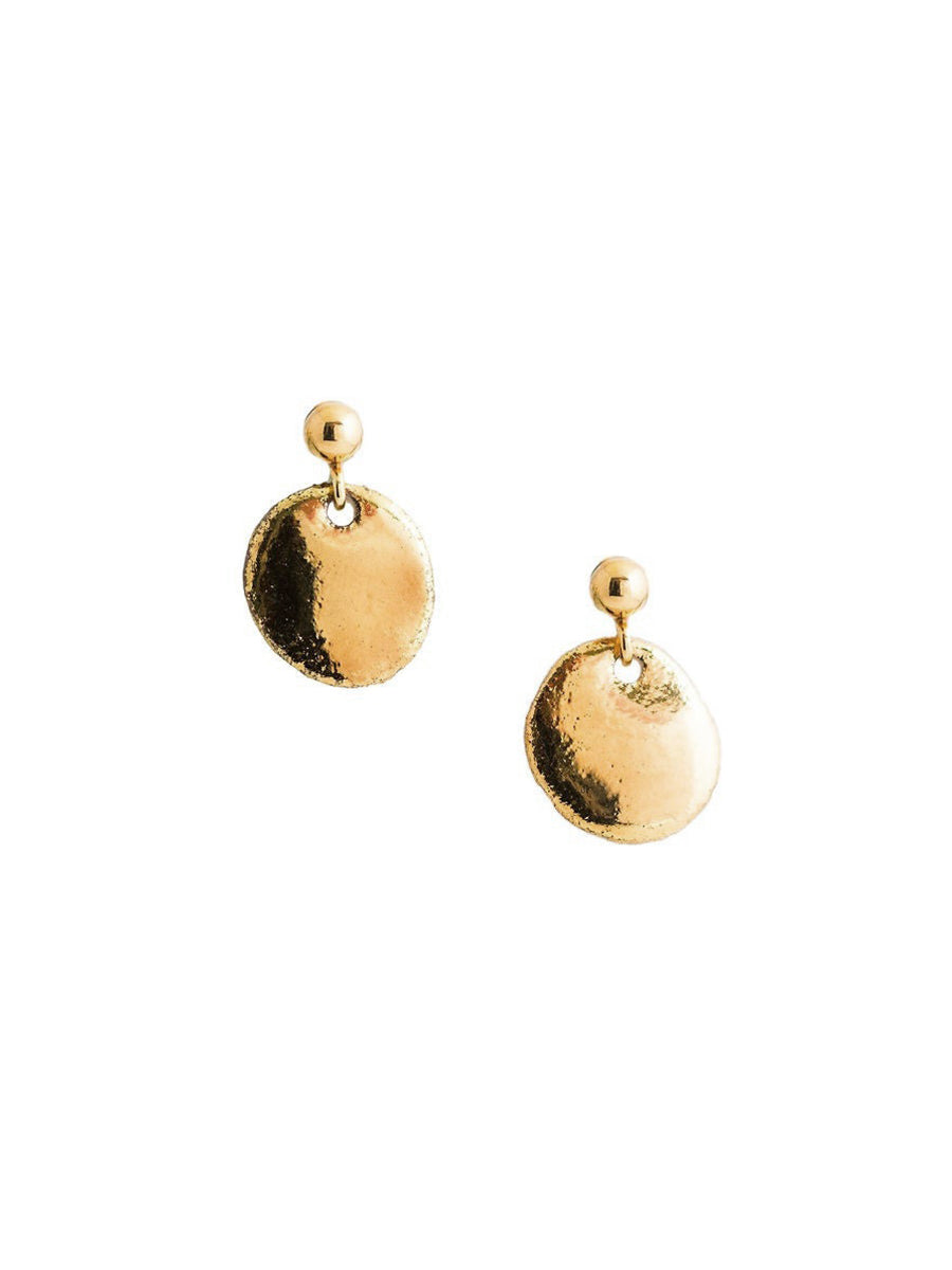 Simple, but special, pinched porcelain drop studs made from kiln-fired raw porcelain glazed with 22K gold luster & finished with 14K gold-filled hardware.