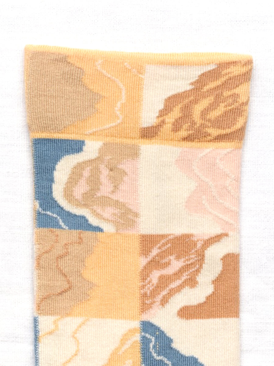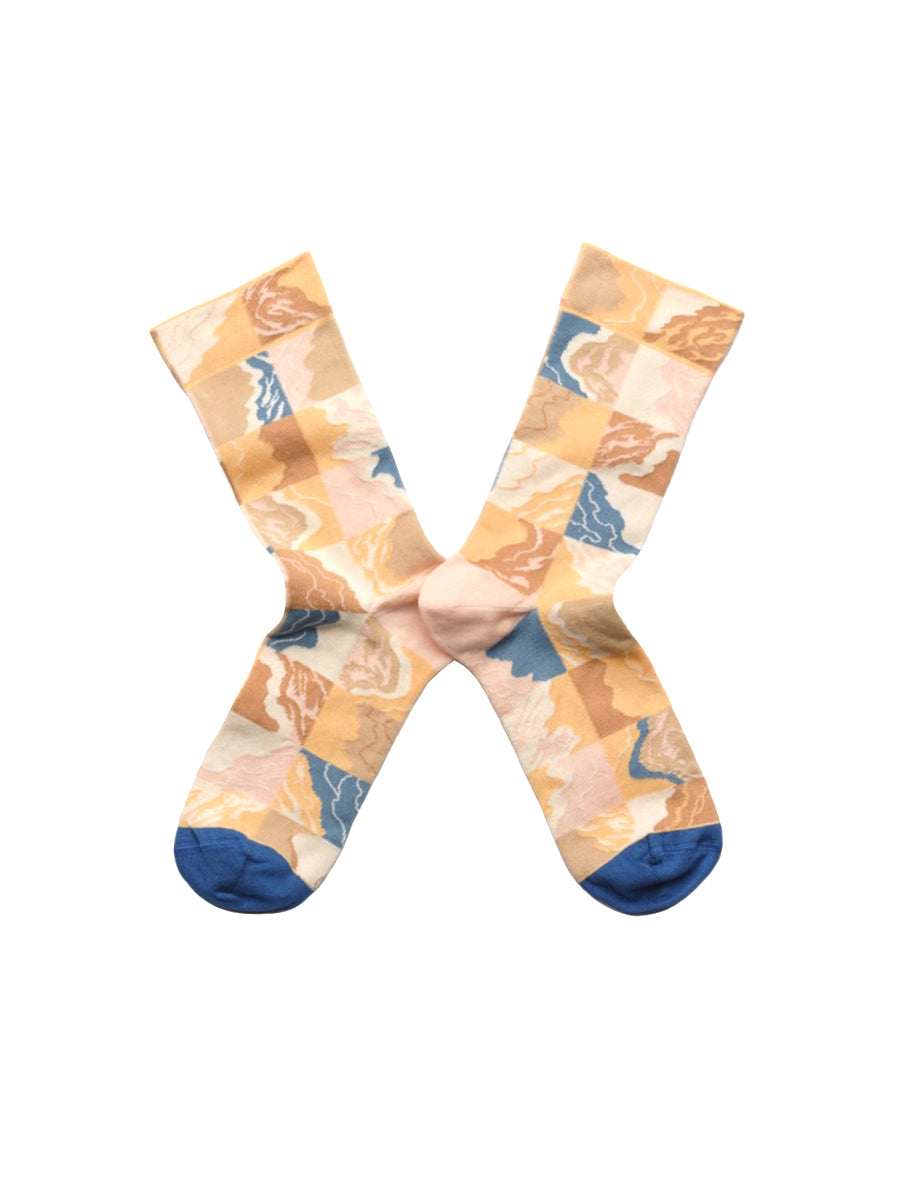 Modern classic fine-knit rib socks with earth-tone abstract tiles on a blue background and contrasting toe