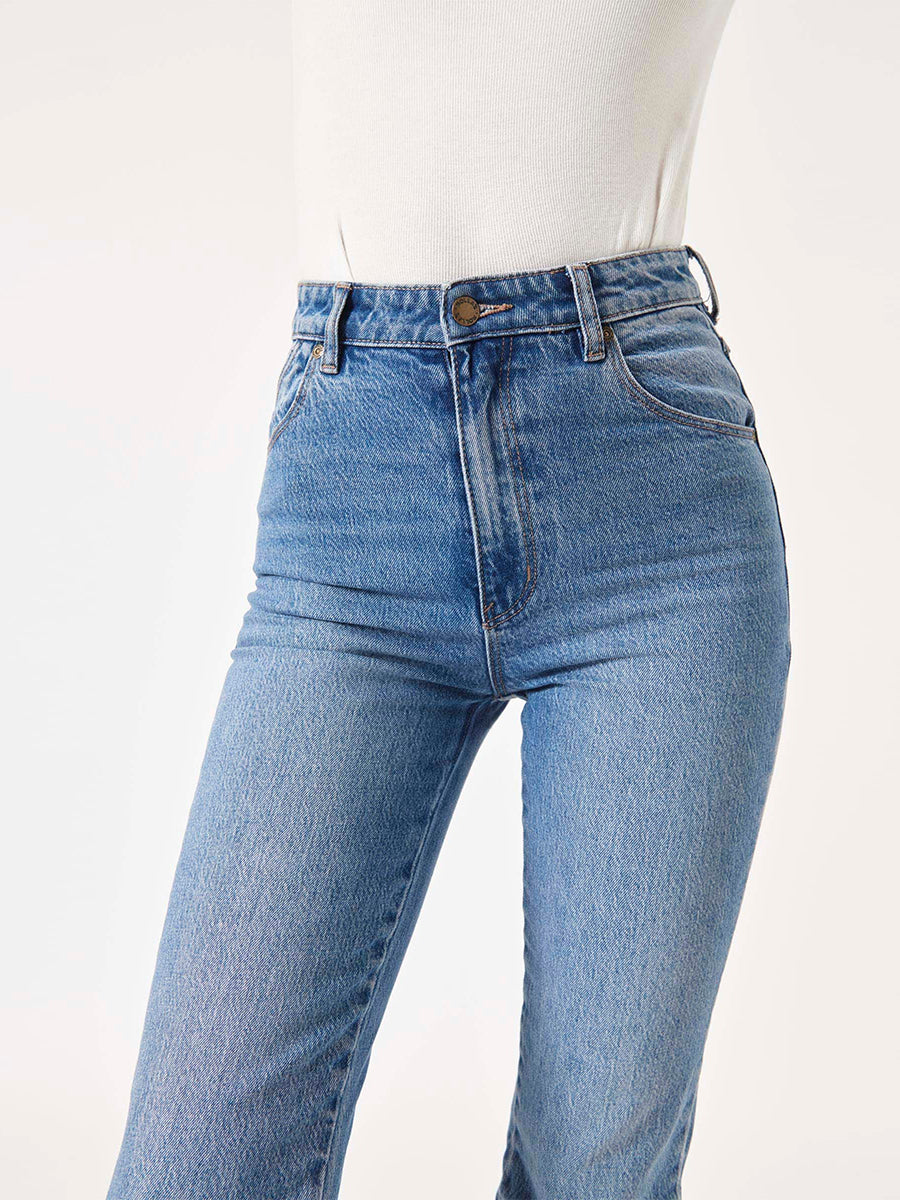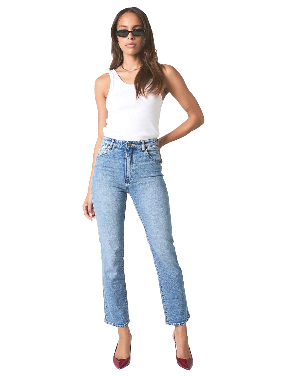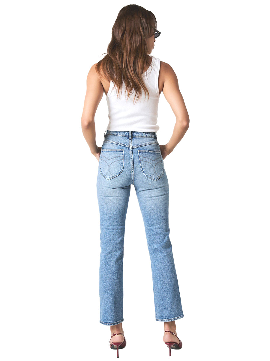 High-rise, fitted, slim-straight leg jean in a medium-light blue