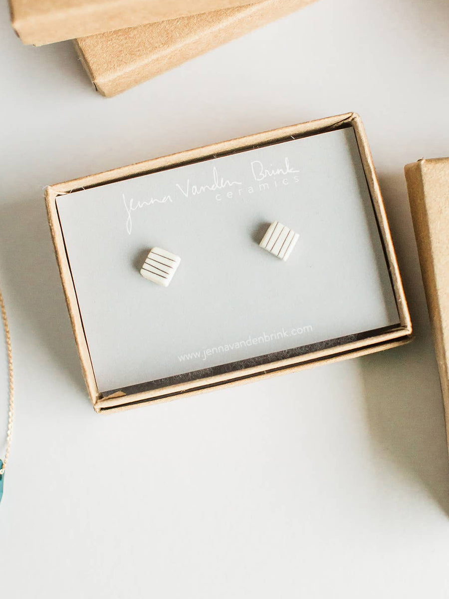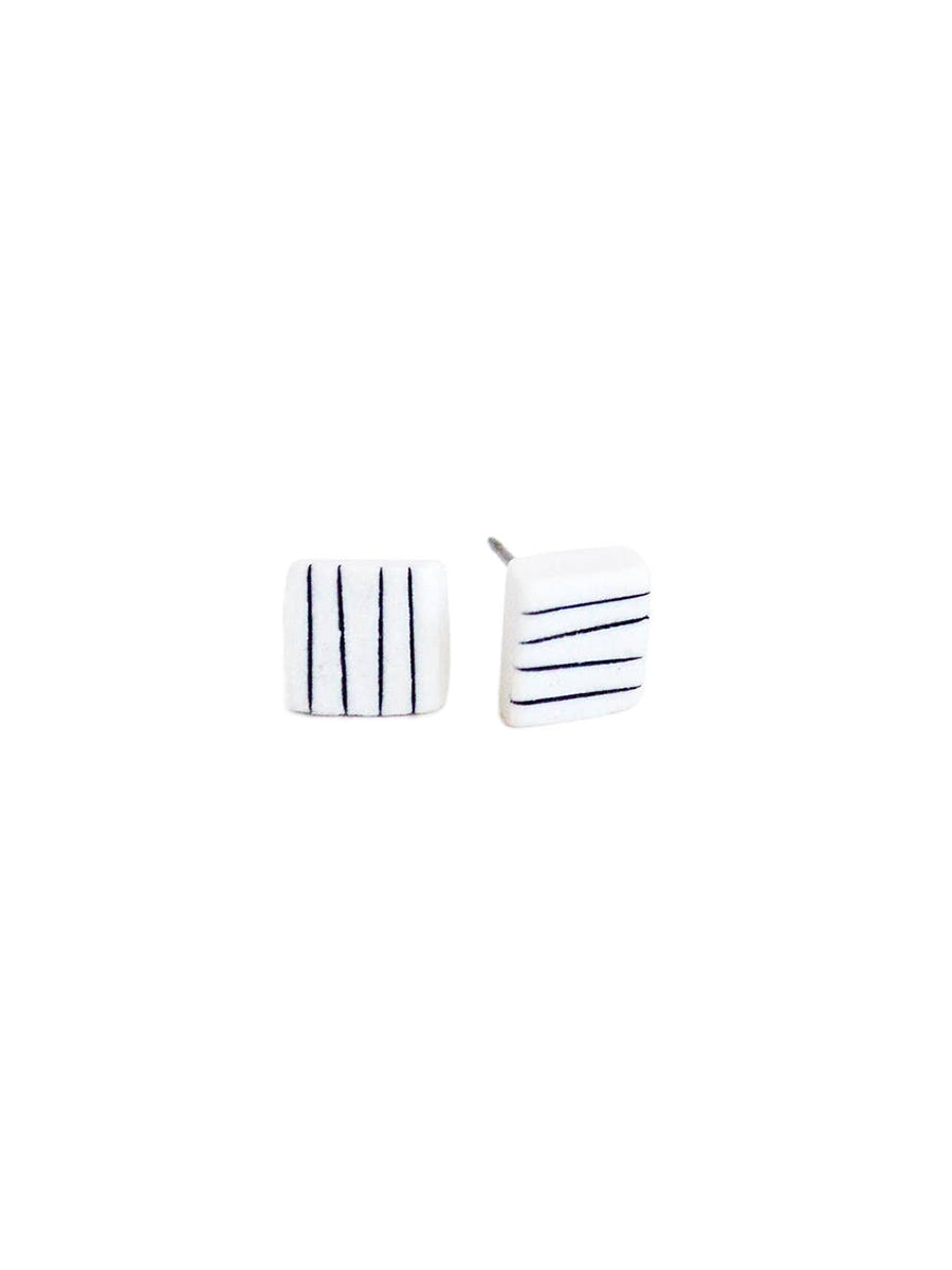 Versatile black & white pinstripe square studs made from hand-formed & kiln-fired raw porcelain, with hypoallergenic titanium posts.