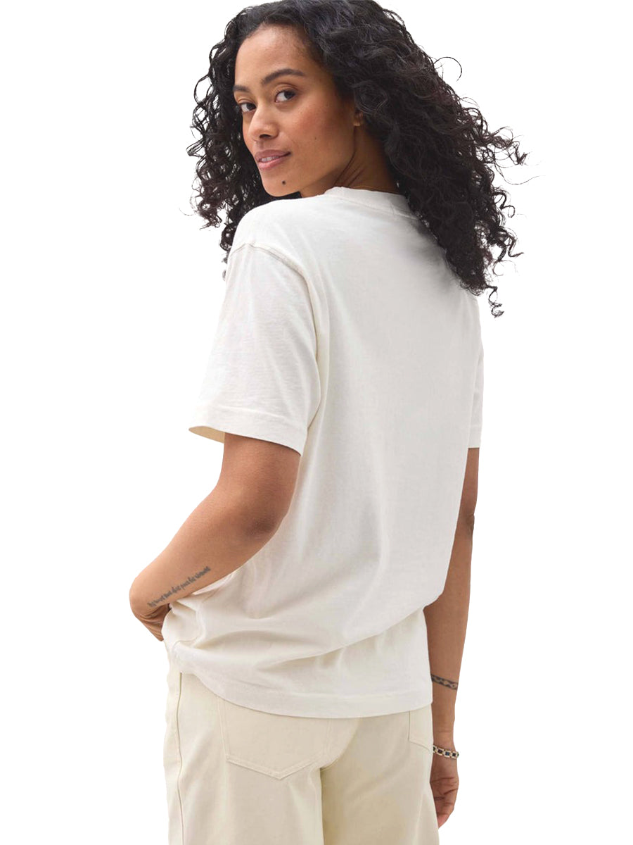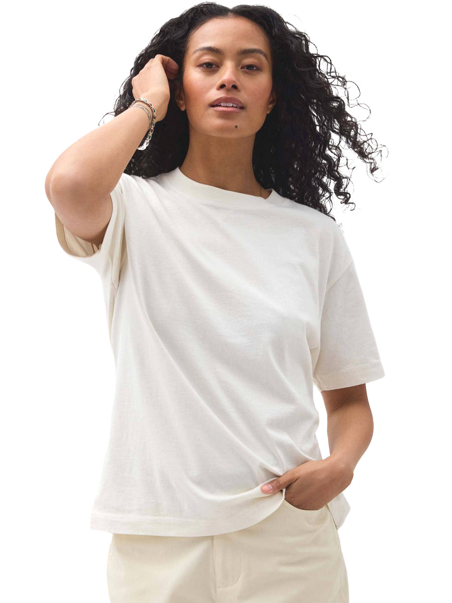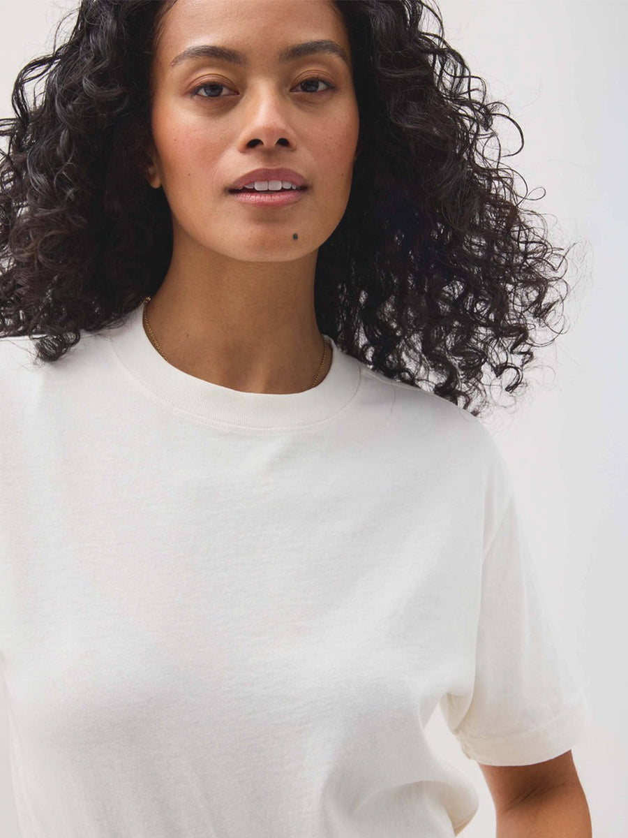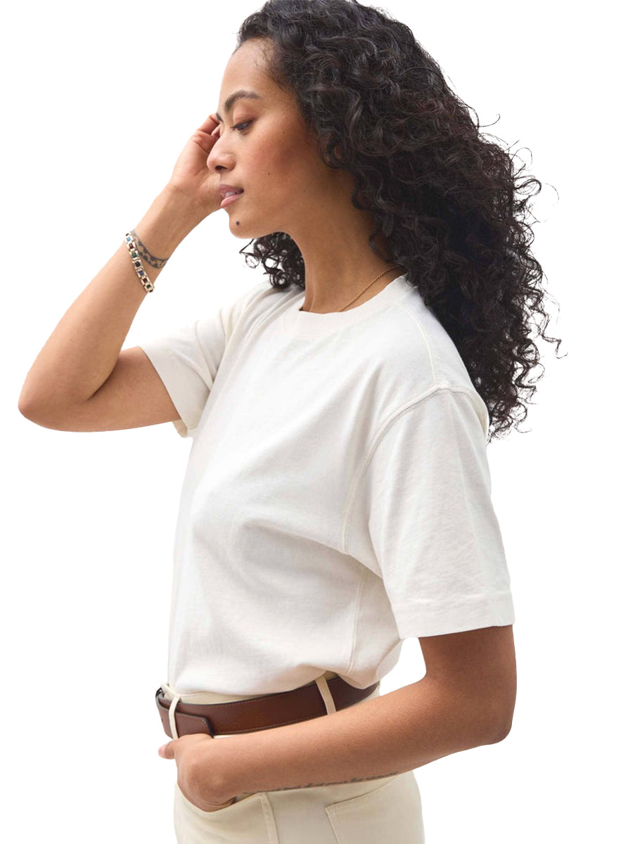 Relaxed short sleeve tee with a longer length, (that can be tucked in), in soft cotton.