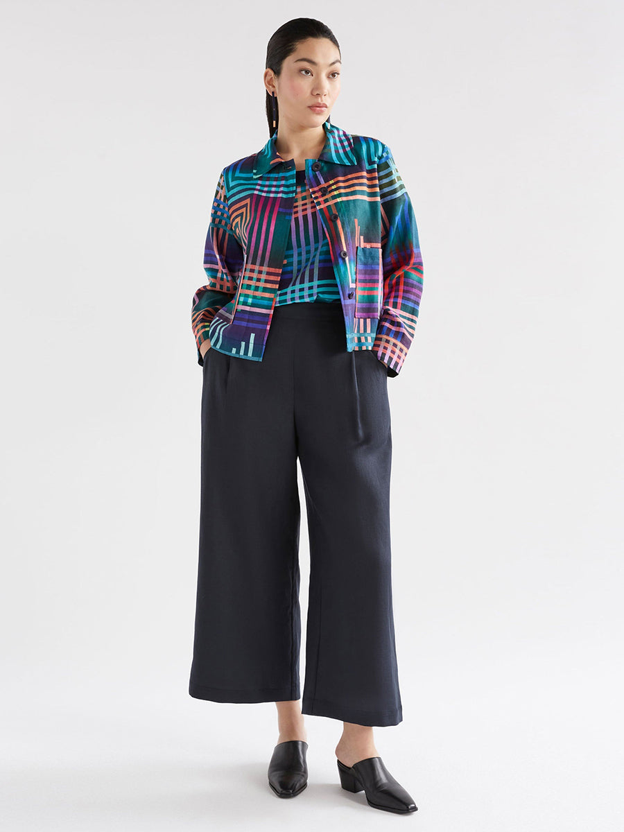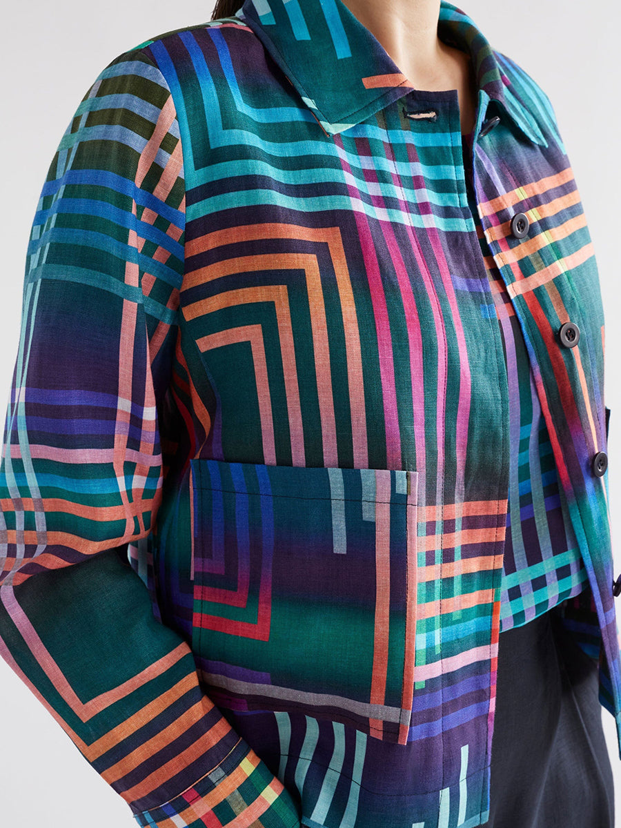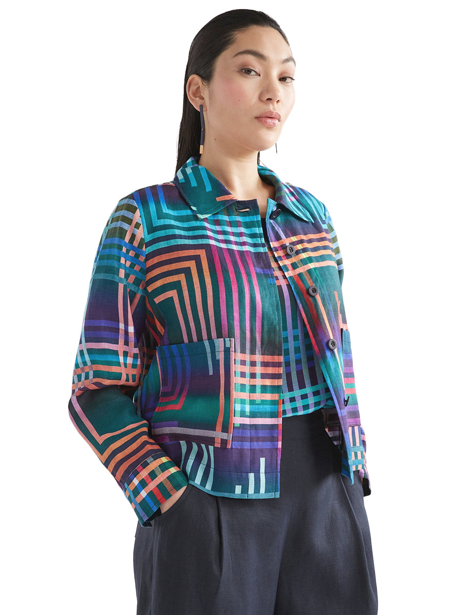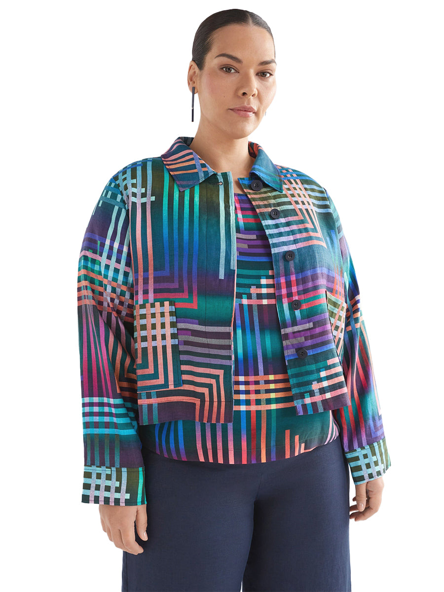 Lightweight linen cropped jacket in a colorful custom print that's perfect for layering or as a party outfit statement piece.