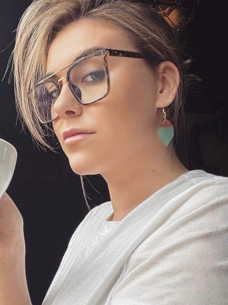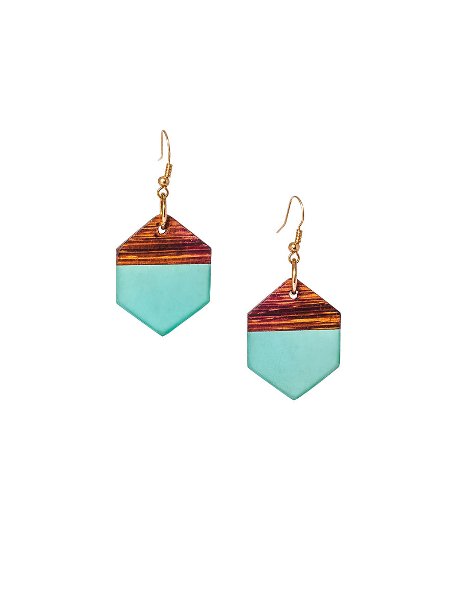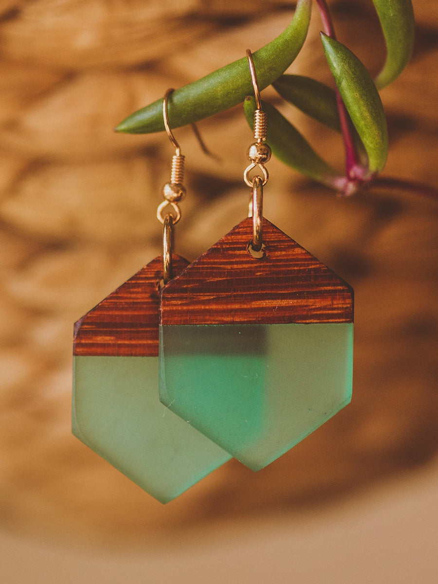 Lightweight & fun geometric dangle earrings made from a wood & resin mix.