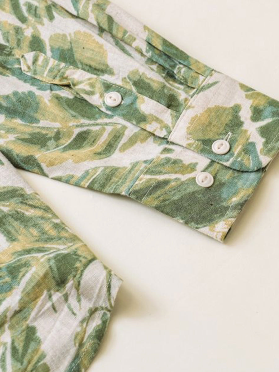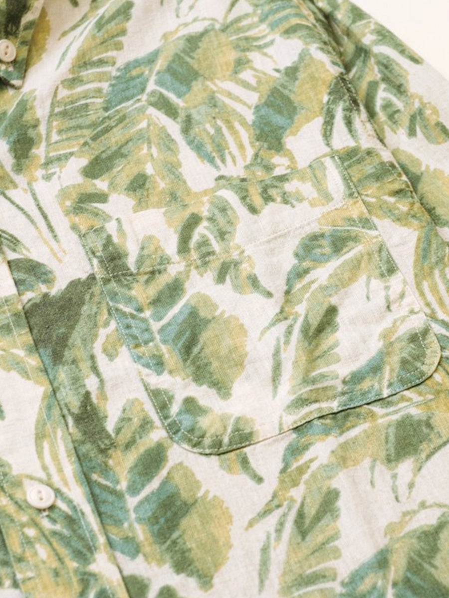 Lightweight linen & cotton plaid button-down shirt with an all-over tropical plant print.