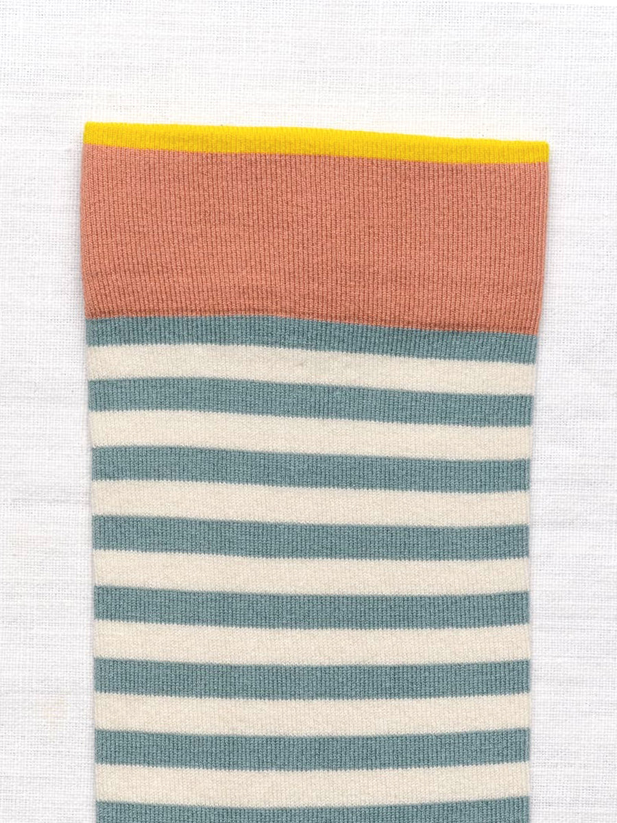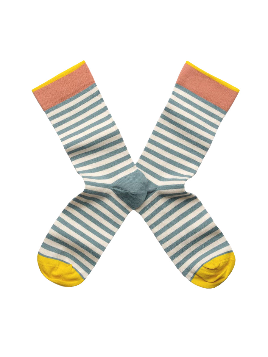 Modern classic lightweight fine-knit rib socks in a arctic blue-green & white stripe, yellow & orange cuff, & a yellow toe.
