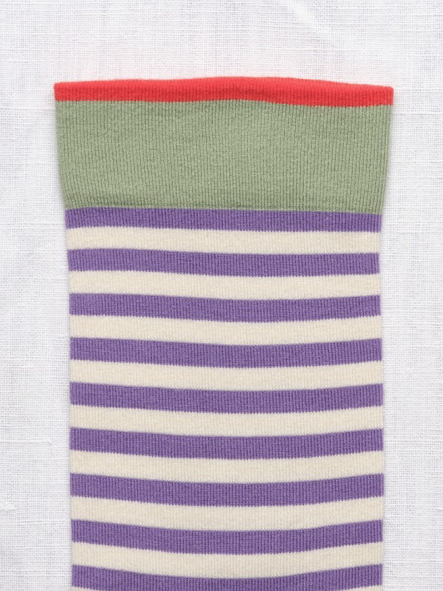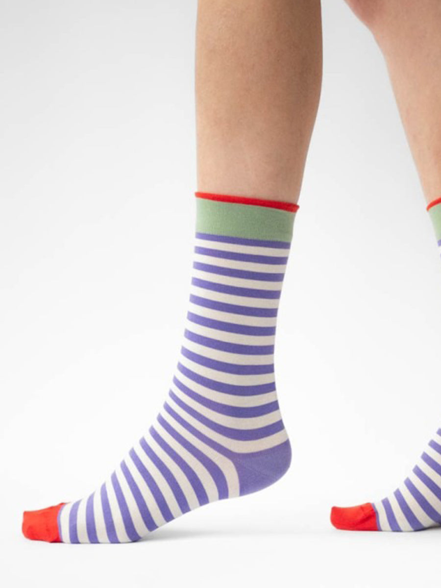 Modern classic lightweight fine-knit rib socks in a purple & white stripe, red & green cuff, & a red toe.