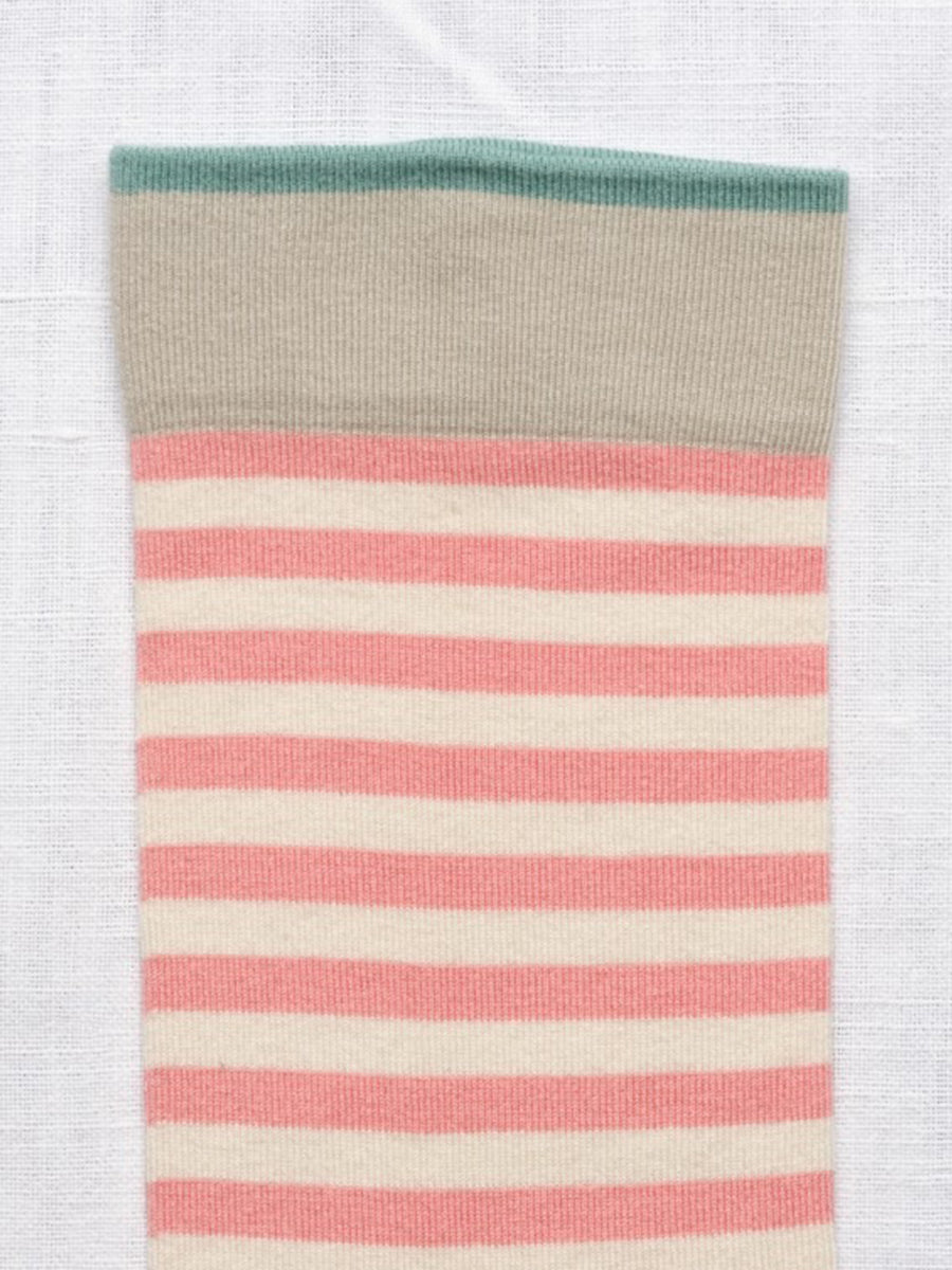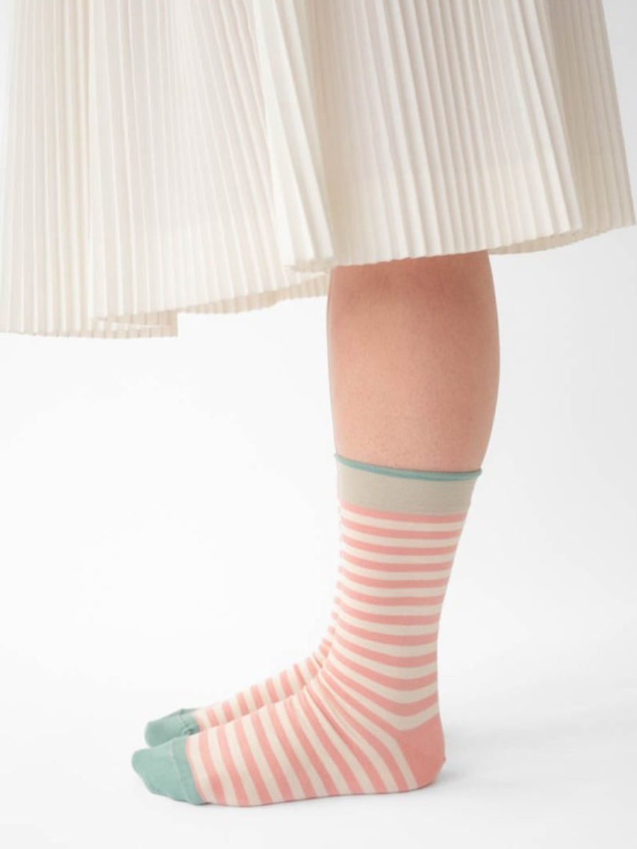 Modern classic lightweight fine-knit rib socks in a soft pink & white stripe, teal & beige cuff, & a teal toe.