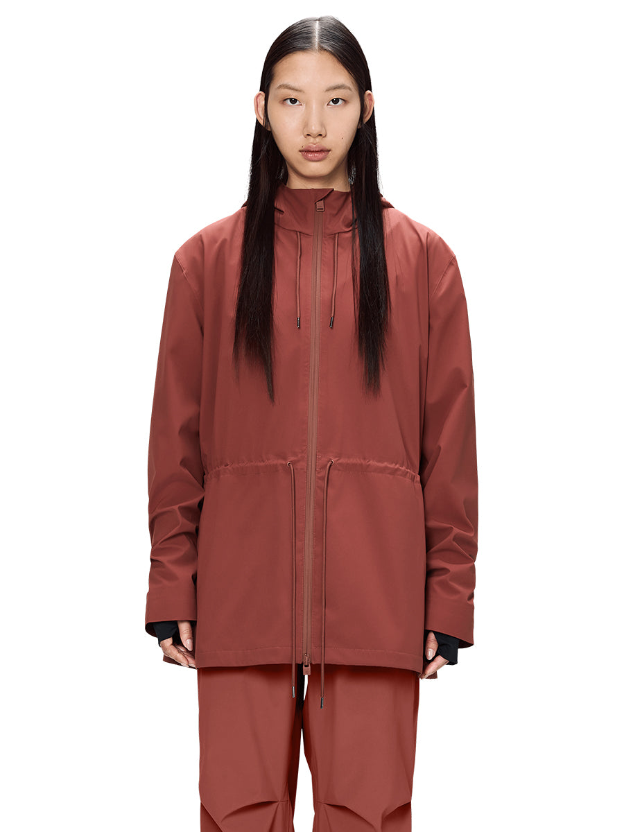 Women's tech nylon zip-through rain jacket with a waist cinch for an adjustable silhouette.