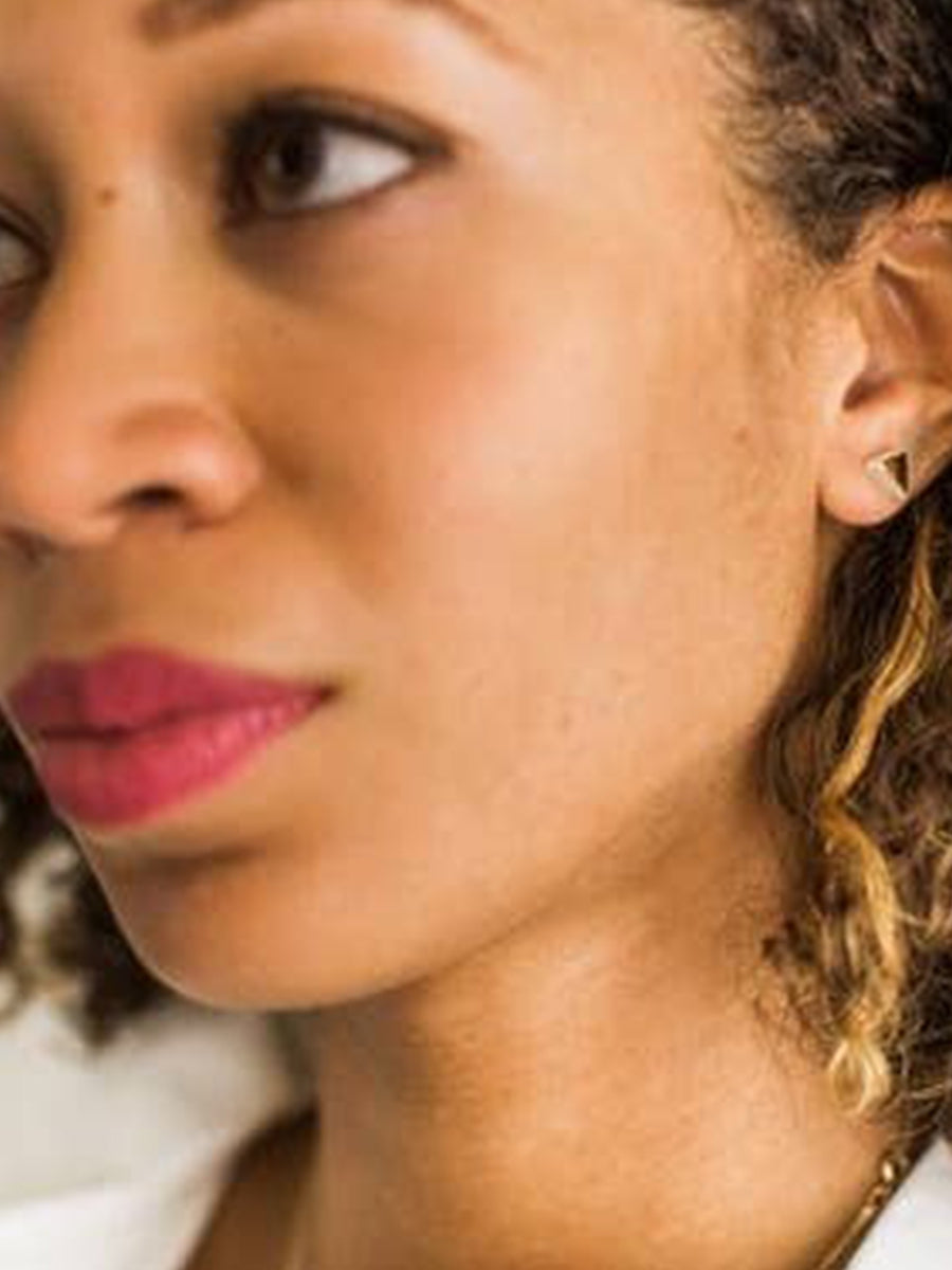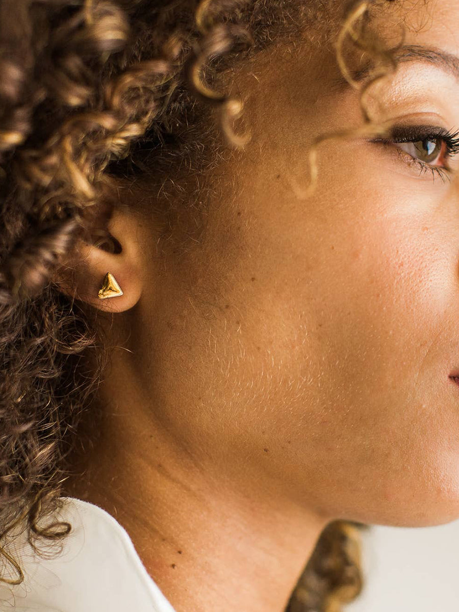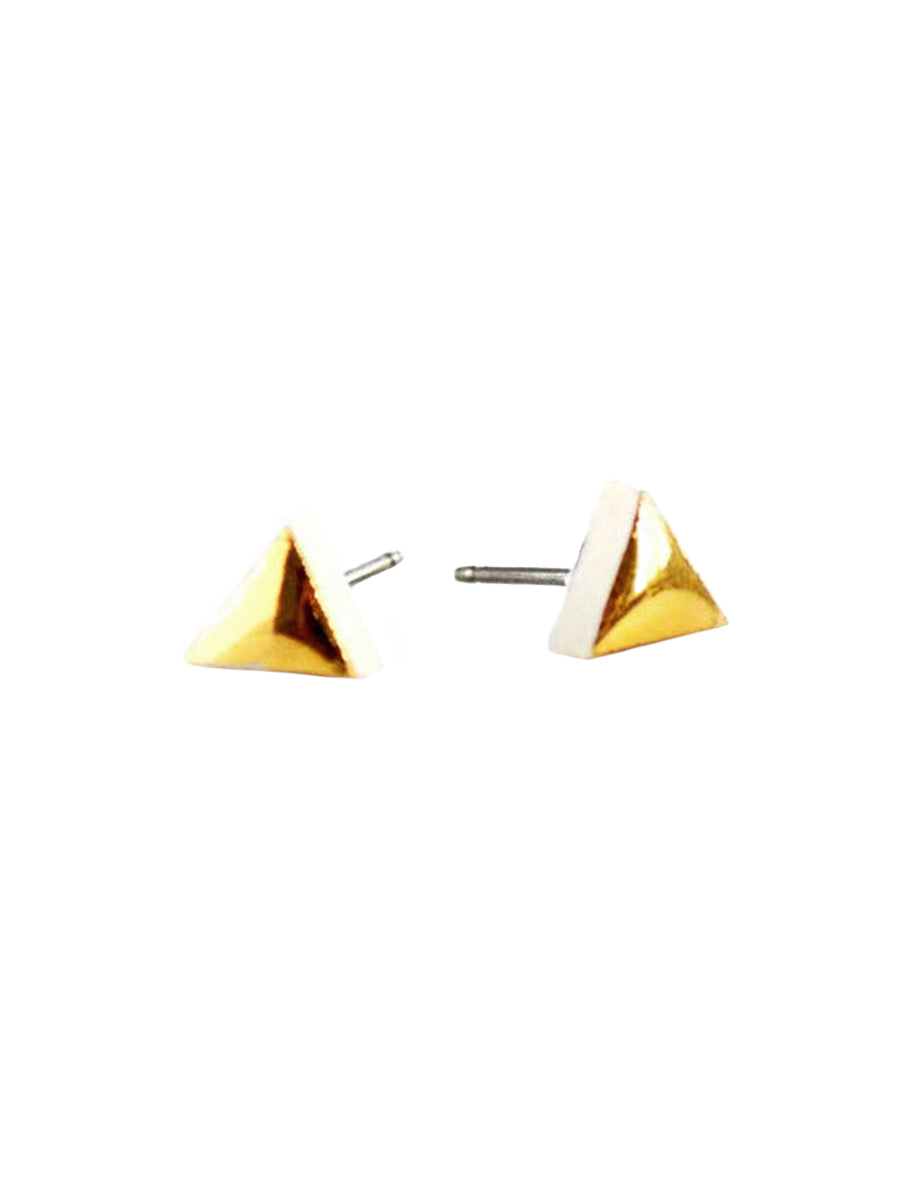 Dainty, but shiny, dimensional triangle studs made from kiln-fired raw porcelain with a gold-luster finish on front.