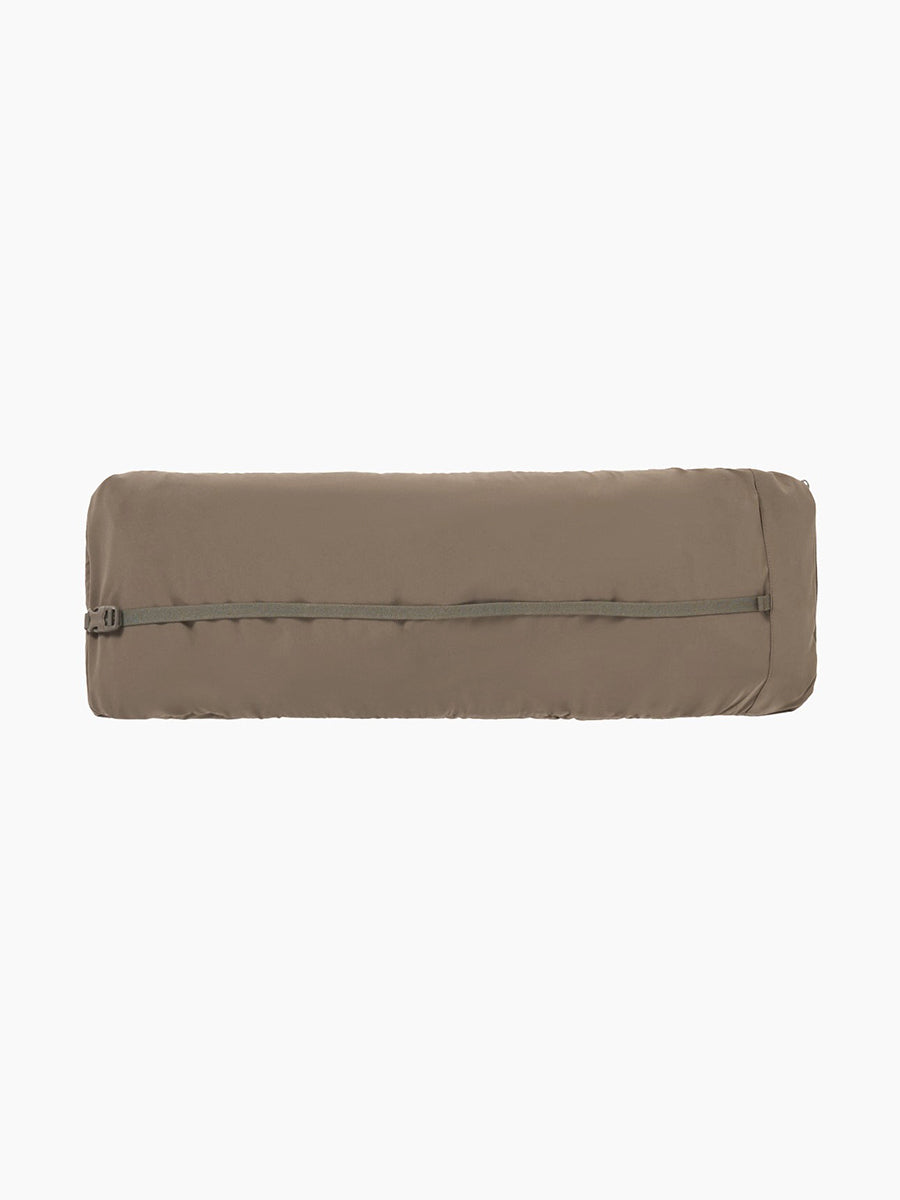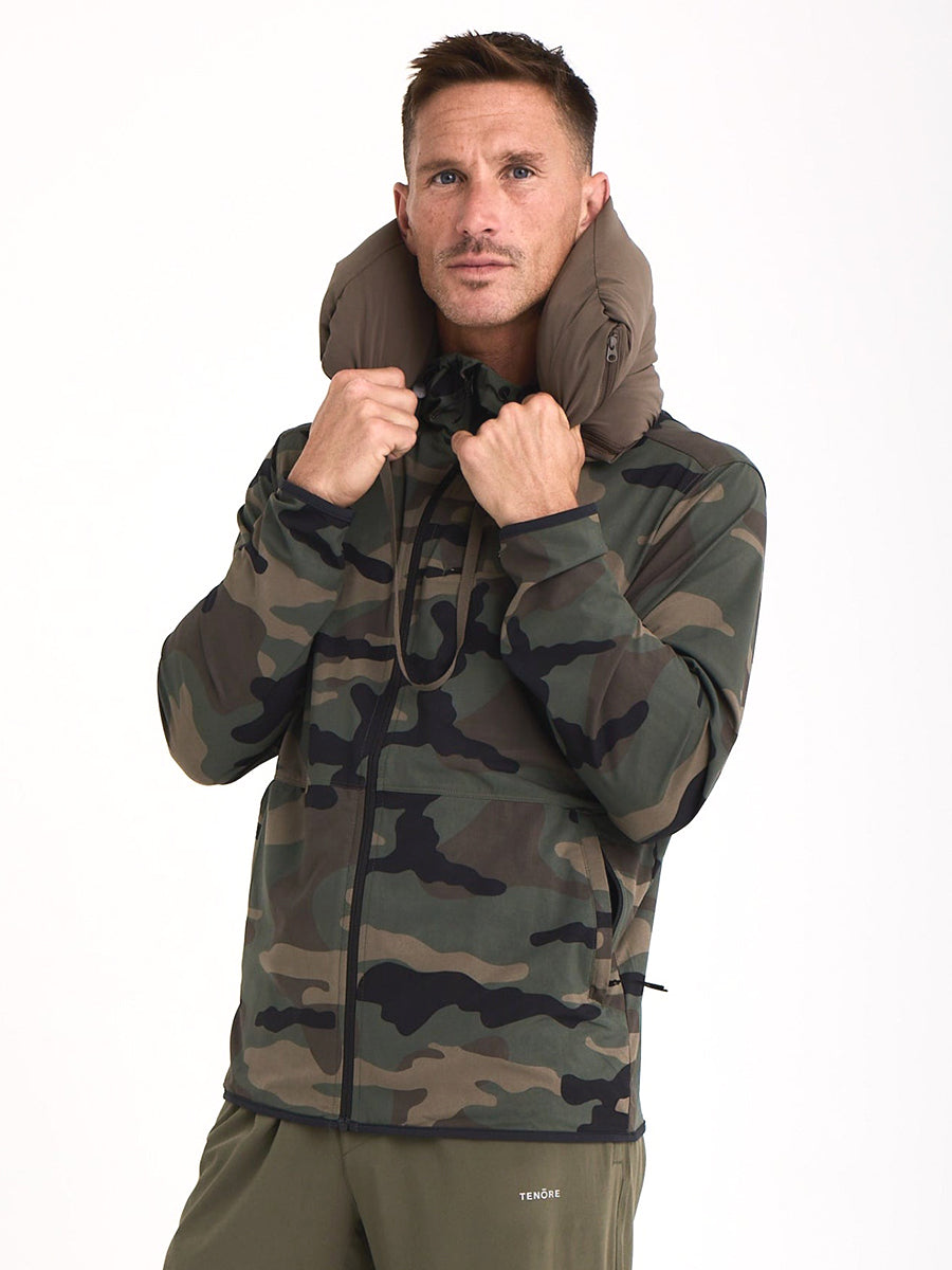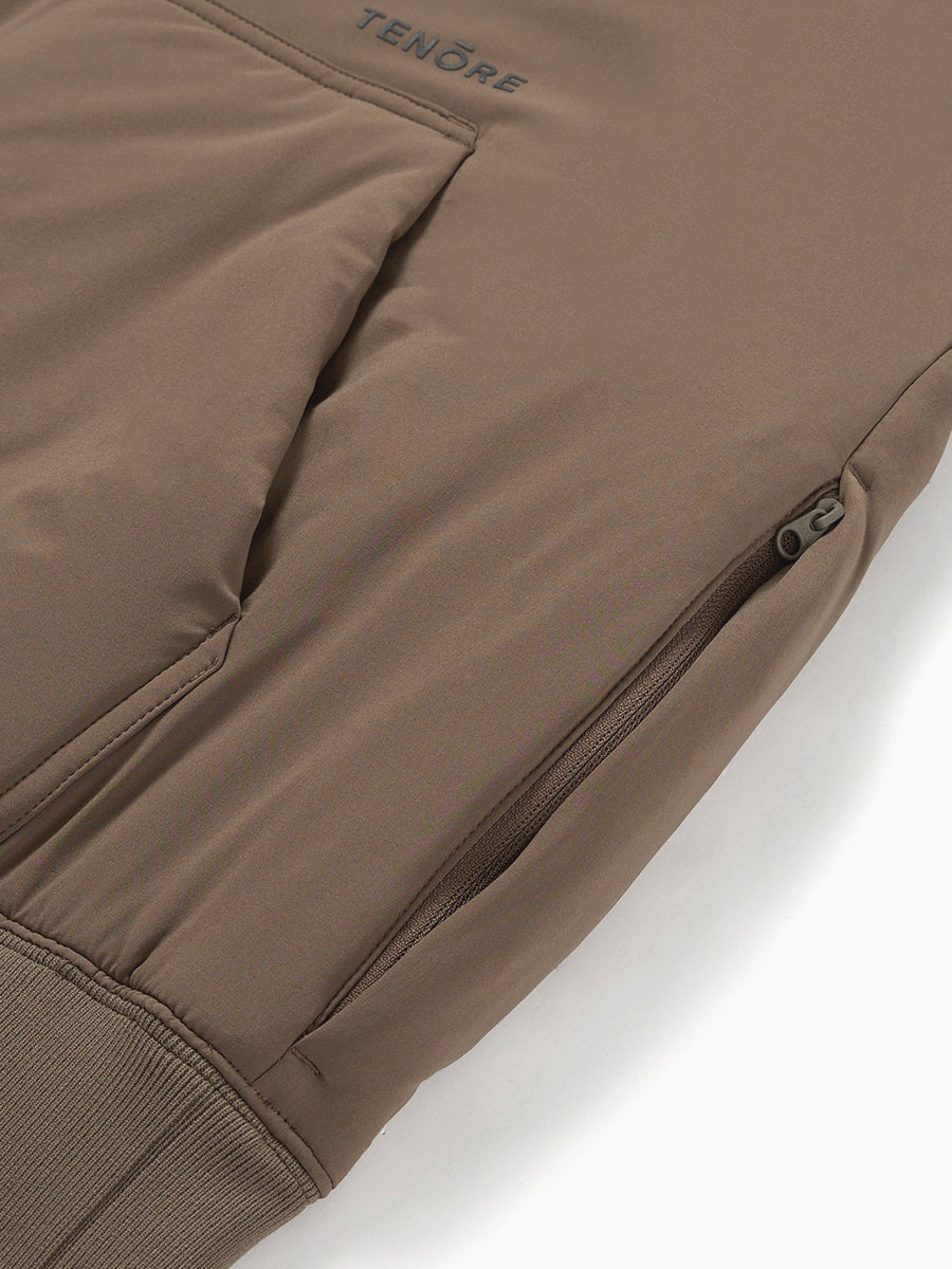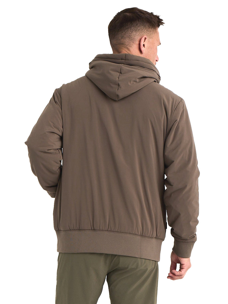 Stretch poly hooded sweatshirt that has a lightweight fill for a bit of extra warmth, and can be packed into a discreet pocket for use as a travel pillow when needed.