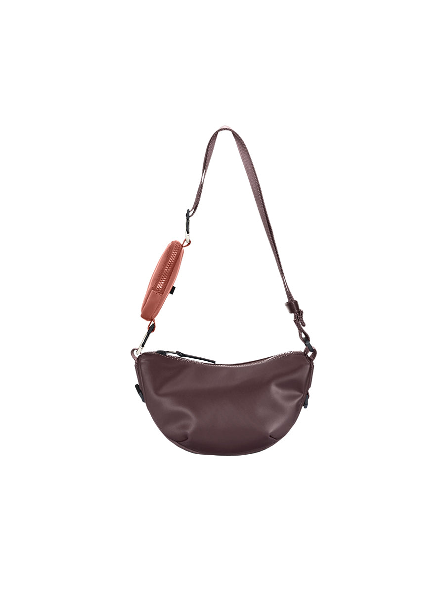 Clean & stylish mini crescent waterproof crossbody (or shoulder) bag with an adjustable strap and detachable pouch, in deep brown-burgundy with a subtle sheen.