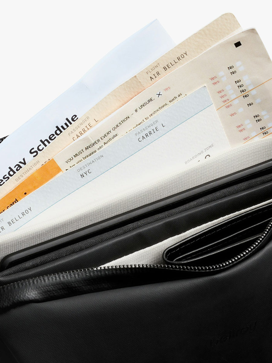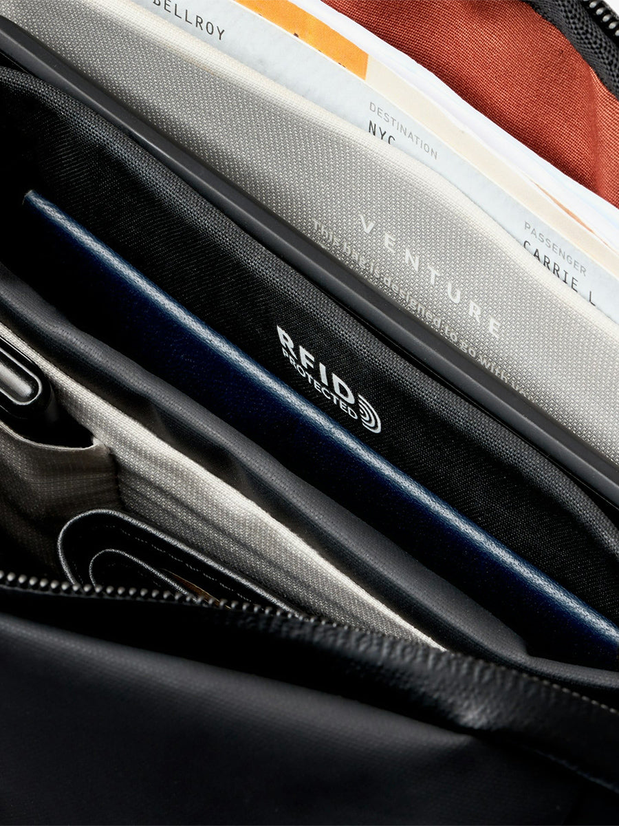 Sleek travel-friendly water-resistant crossbody sling bag with interior organization & an RFID passport pocket.