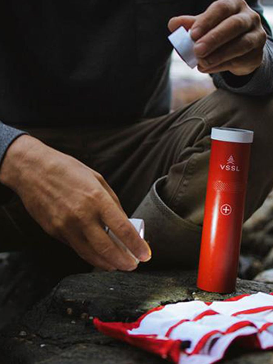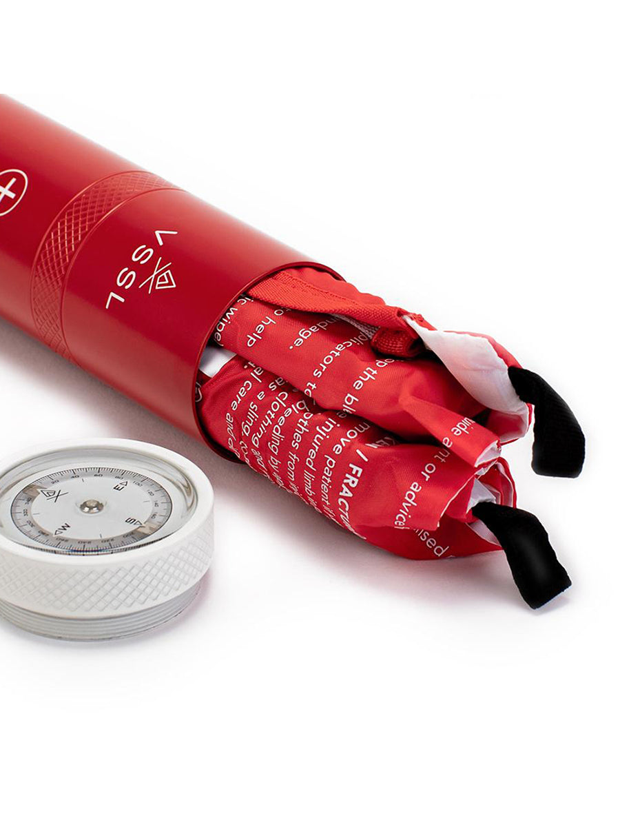 - Pre-packed first aid kit stored inside canister, one end unscrews to allow access.