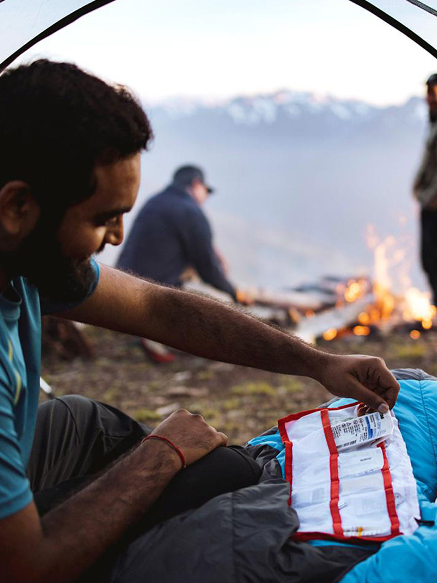 - 46-item first aid kit, includes bandages, coagulating agent, face masks, tape, tweezers, whistle, gloves, and antibiotic & burn cream.